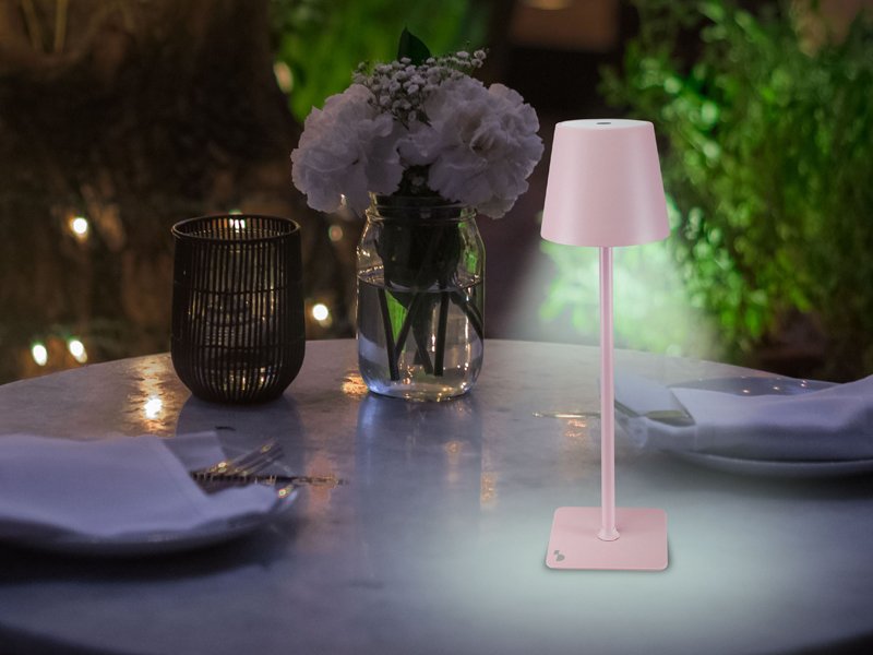 Rechargeable table lamp with touch switch. With a simple touch, you can choose between warm, cold or natural light. The light intensity can be adjusted by holding down the power button. Water-resistant, it can be used both indoors and outdoors. The included 33mm bottle adapter offers an elegant alternative to the table version by being able to place our lamp on your favourite bottle in the centre of your table. USB charging cable included in the package.