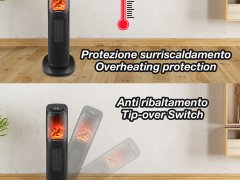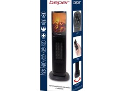 Elegant turret fan heater with ceramic heating elements with a powerful heating effect and low consumption. Equipped with touch control panel with remote control and programmable timer up to 8 hours. LED light with flame effect, for a warm and cosy atmosphere in every room. Adjustable thermostat and ventilation function, automatic horizontal oscillation and LED display.