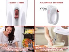 Sbattitore elettrico leggero, ideale per montare uova e mescolare creme e dolci. Lo sbattitore ha 5 velocità selezionabili e in dotazione una coppia di fruste in acciaio per montare e mescolare. Le fruste sono removibili mediante il tasto di rilascio fruste e lavabili in lavastoviglie. Impugnatura ergonomica per una facile presa.
