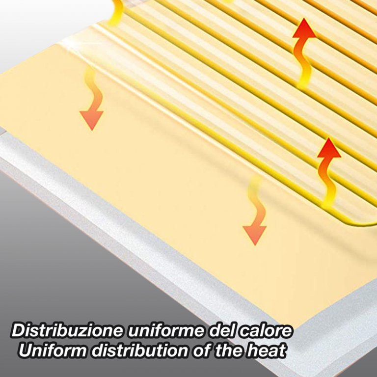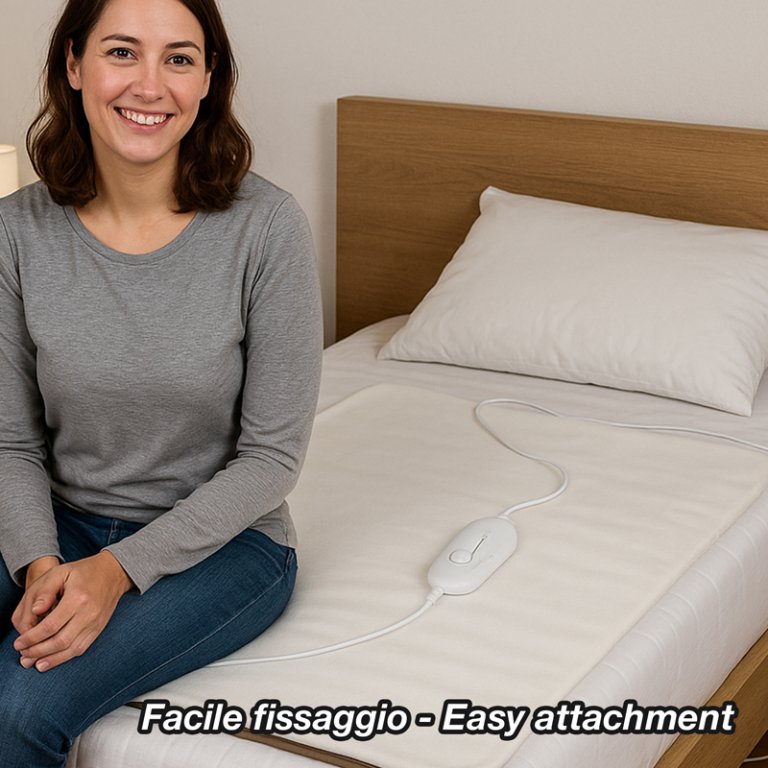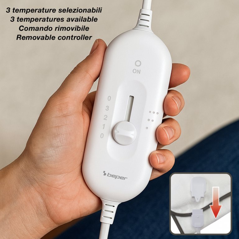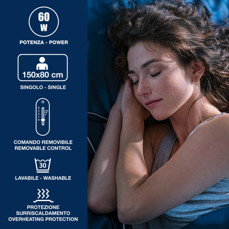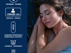 Heizdecke aus Soft-Touch-Polyester mit 2 Temperatureinstellungen, die über die Fernbedienung ausgewählt werden können. Einfache Befestigung an der Matratze dank der Schlitze für das Gummiband. Dank des abnehmbaren Controllers bei 30 ° C maschinenwaschbar. Arbeitslicht und automatisches Abschaltsystem bei Überhitzung zur sicheren Verwendung. Abmessungen 150x80 cm.