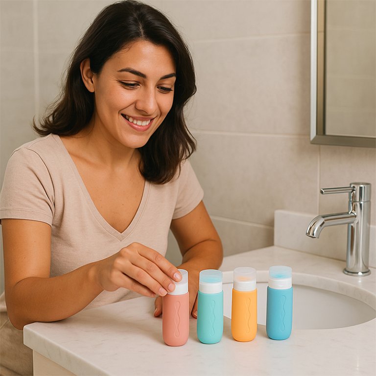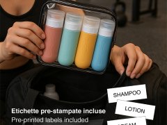 Praktisches 4-teiliges Reiseflaschenset aus Silikon, um Cremes, Shampoos und Lotionen unterwegs optimal zu organisieren. Jede Flasche hat ein Fassungsvermögen von 90 ml und besteht aus BPA-freiem Silikon, das leicht, flexibel und extrem widerstandsfähig ist.