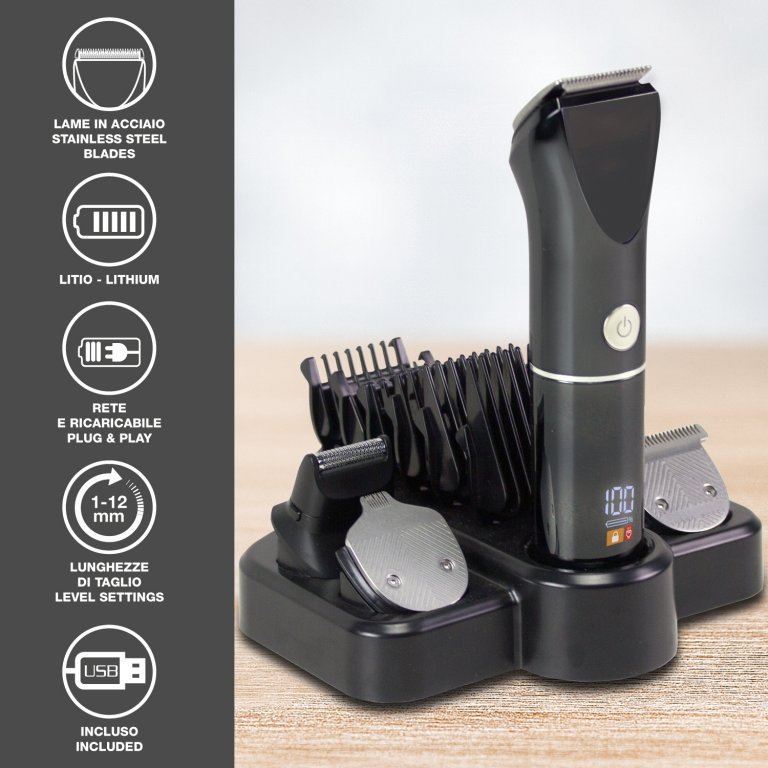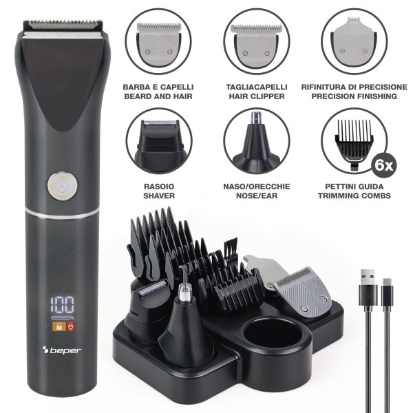 Maximale Vielseitigkeit und Praktikabilität in einem einzigen Gerät: Der BEPER TrimX 12 ist das Pflegeset für die komplette Pflege von Gesicht, Haar und Körper. 12 Zubehörteile für alle Rasierbedürfnisse: Haarschneider, Barttrimmer, Nasen- und Ohrentrimmer, Rasiermesser und Präzisionstrimmer für definierte Konturen. Mit den 6 mitgelieferten Trimmerkämmen können Sie die Schnittlänge an Ihren Stil anpassen. Langlebige Stahlklingen garantieren ein präzises und langanhaltendes Ergebnis, während das integrierte LED-Display alle nützlichen Informationen anzeigt: Ladestand, Akkustatus und Tastensperre - ideal auch auf Reisen. Dank Plug&Play-Funktion kann er auch im Netzbetrieb verwendet werden. Ergänzt wird das Set durch einen Ständer, ein USB-Kabel, eine Reinigungsbürste und Schmieröl für die schnelle und einfache Pflege.