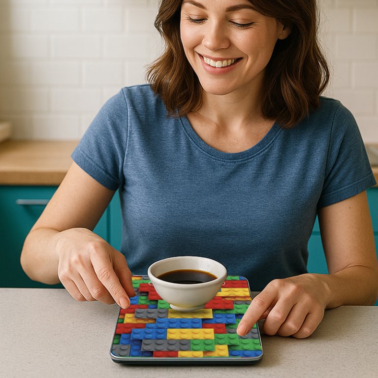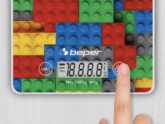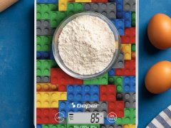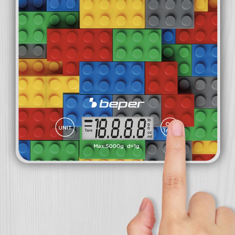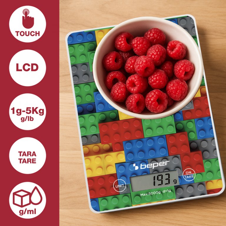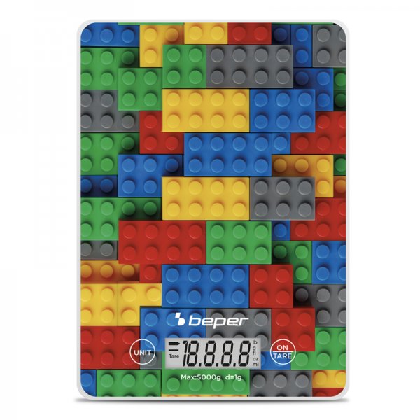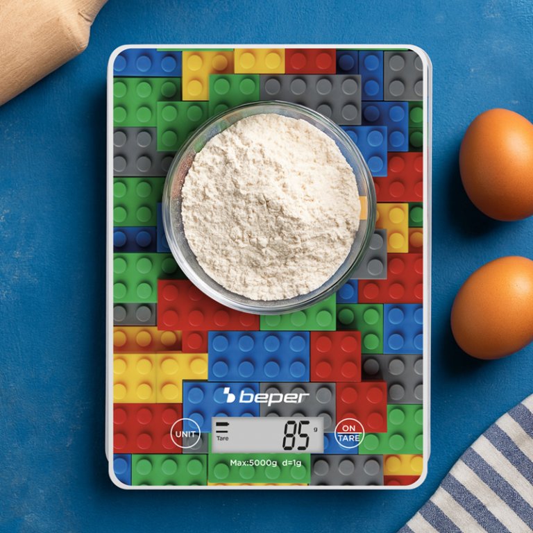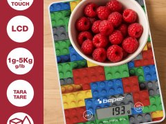 The Beper digital kitchen scale combines compact design and advanced features to accurately weigh solid and liquid foods. Featuring a tempered glass plate with an innovative colored brick pattern, it's perfect for those seeking practicality without sacrificing style. The tare function allows you to weigh multiple ingredients in succession, while the touch buttons and LCD display ensure simple and immediate use. Thanks to the rear hook, it can be hung to save space in the kitchen. The high-precision sensor measures from 1 g to 5 kg, with the option to select between grams and pounds. Complete with automatic shut-off and battery included, for a ready-to-use experience.