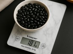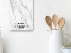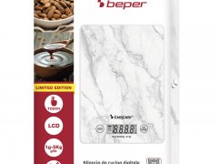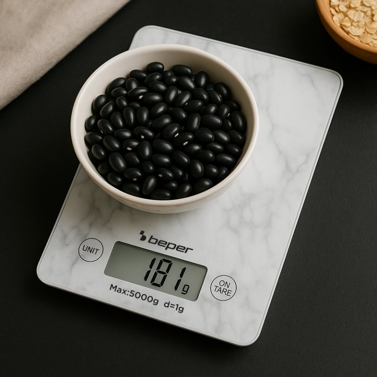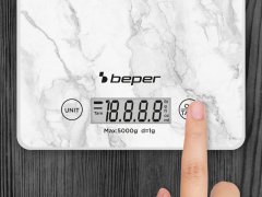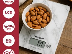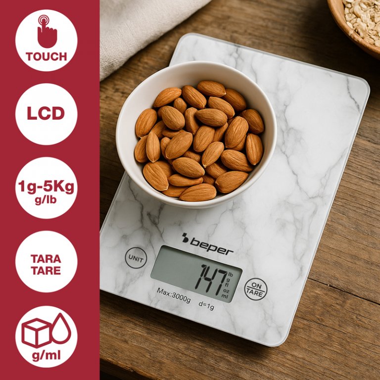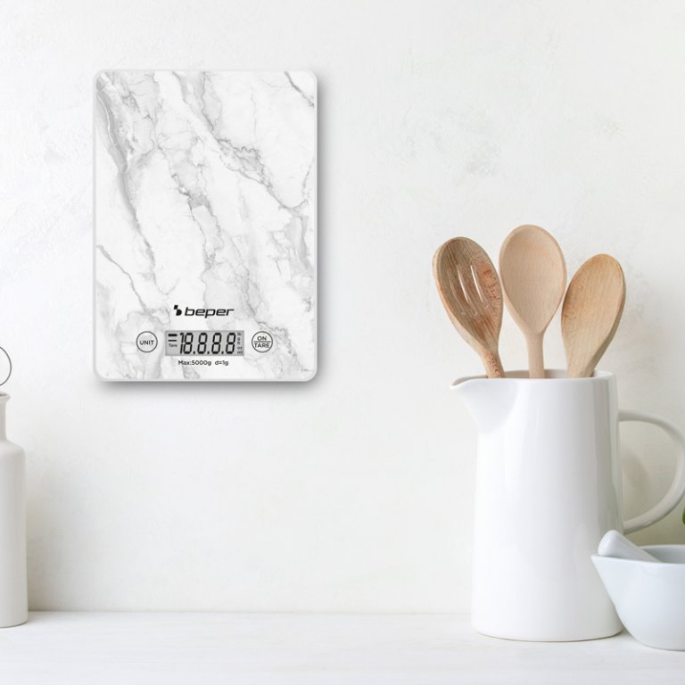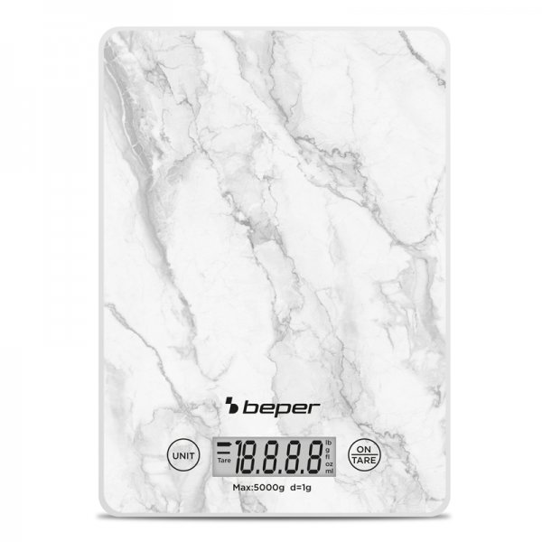 The Beper digital kitchen scale combines compact design and advanced features to accurately weigh solid and liquid foods. Featuring a tempered glass plate with innovative patterns, it's perfect for those seeking practicality without sacrificing style. The tare function allows you to weigh multiple ingredients in succession, while the touch buttons and LCD display ensure simple and immediate use. Thanks to the rear hook, it can be hung to save space in the kitchen. The high-precision sensor measures from 1 g to 5 kg, with the option to select between grams and pounds. Complete with automatic shut-off and battery included, for a ready-to-use experience.