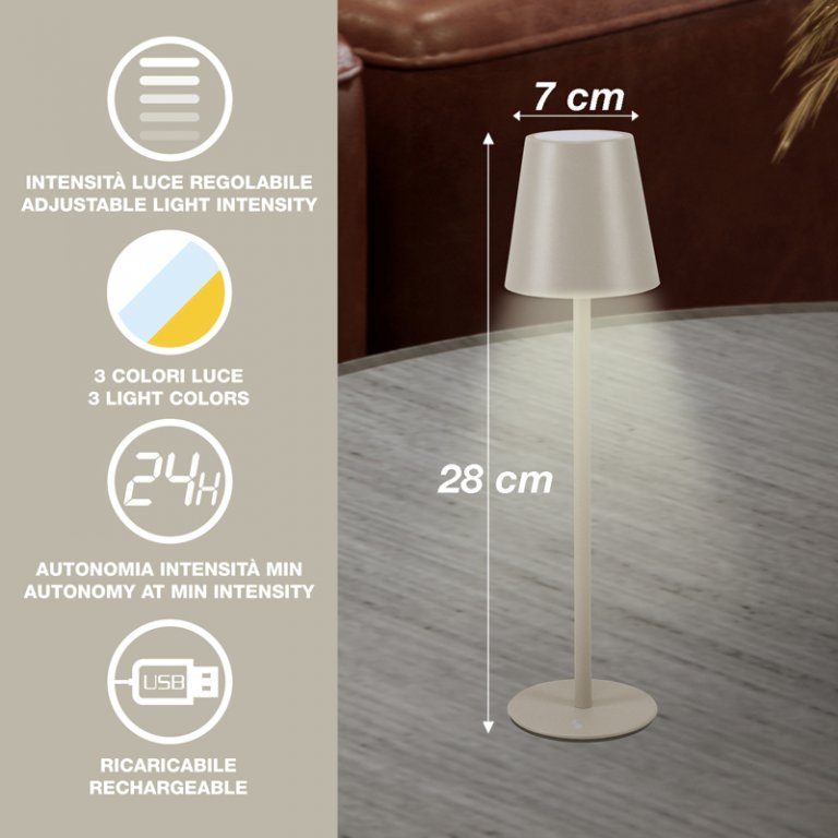 Éclairez votre espace avec style et praticité grâce à la lampe de table rechargeable Beper. Avec son interrupteur tactile et son design moderne, elle est parfaite pour votre bureau, votre table de chevet ou pour être emportée partout où vous le souhaitez. Une simple pression vous permet de choisir entre la lumière chaude, froide ou naturelle, tandis que le maintien du bouton permet de régler facilement l'intensité de la lumière en fonction de l'environnement et de l'heure de la journée. Grâce à la batterie haute capacité intégrée, elle offre une grande autonomie. Rechargeable grâce au câble USB fourni, elle est la solution parfaite pour ceux qui recherchent la fonctionnalité, la liberté de mouvement et une atmosphère personnalisée.