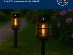 Lot de 2 lampes solaires pour allées et jardins, avec piquet. Les lampes s'allument automatiquement à la tombée de la nuit et s'éteignent à la lumière du jour, grâce à l'énergie fournie par la lumière solaire.