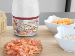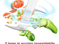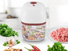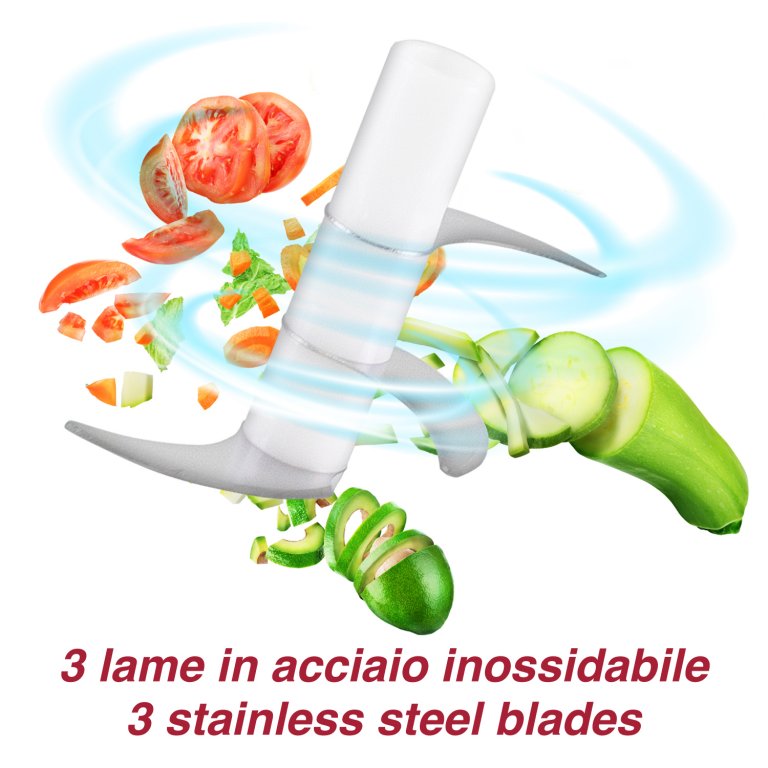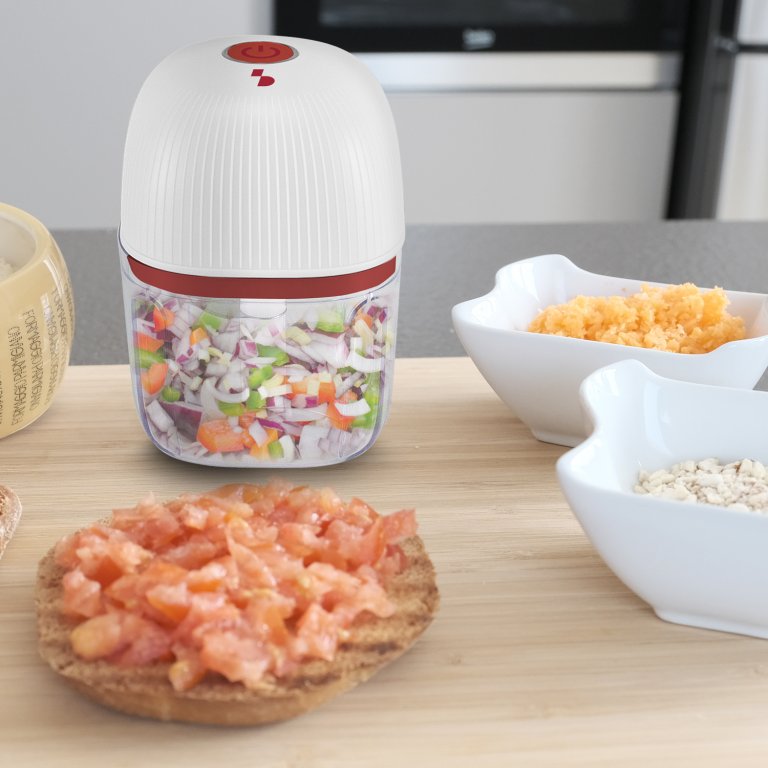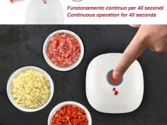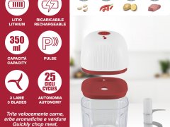 Mini tritatutto ricaricabile con batteria al litio compatto e potente. Il prodotto è dotato di tre lame in acciaio inossidabile che tritano velocemente carne, erbe aromatiche, verdure semplicemente tenendo premuto il tasto di funzionamento. Contenitore da 350ml. Autonomia fino a 20 cicli con ricarica di 5 ore. Inclusa nella confezione un cavo USB per la ricarica.
