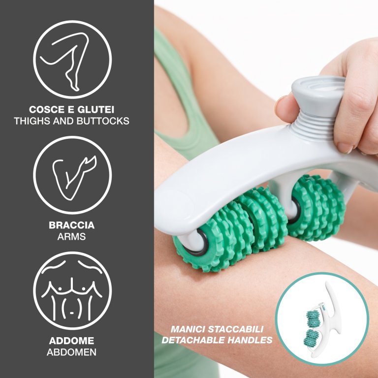 Massaggiatore anticellulite manuale che consente di regolare liberamente intensità e pressione in base alle proprie esigenze. Studiato per favorire la stimolazione della microcircolazione cutanea e supportare il drenaggio dei liquidi in eccesso, contribuendo a una pelle dall’aspetto più tonico e levigato. È dotato di numerosi rulli dentellati che garantiscono un massaggio profondo, intenso ed efficace, ideale per agire sulle zone più critiche. I manici sganciabili permettono un utilizzo pratico e versatile, facilitando il trattamento di aree specifiche del corpo. L’impugnatura ergonomica assicura una presa salda e confortevole durante l’uso, riducendo l’affaticamento della mano. Perfetto per l’applicazione su cosce, glutei, addome e braccia, è indicato per l’uso quotidiano, anche dopo l'attività fisica o insieme a creme specifiche.