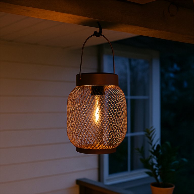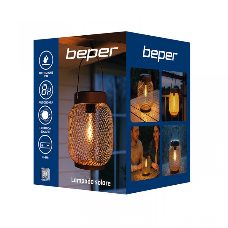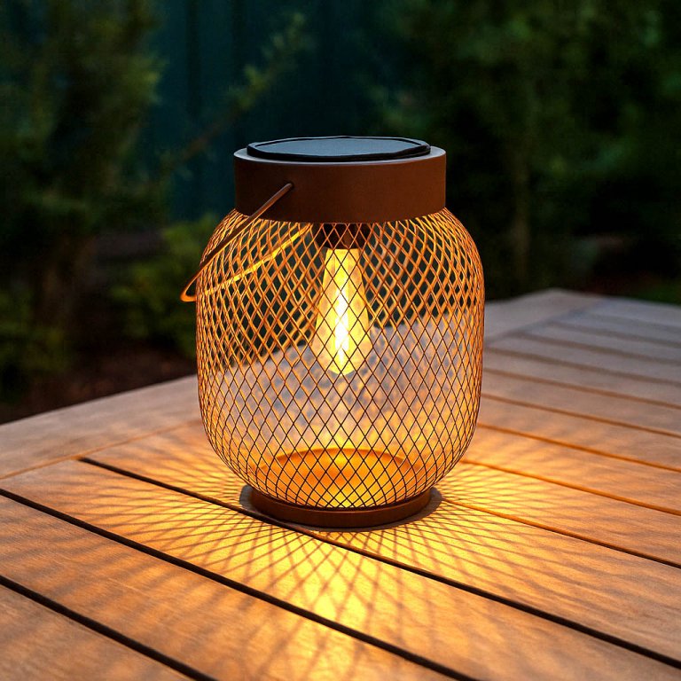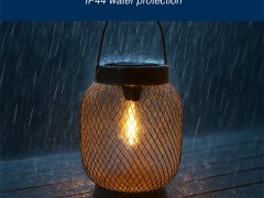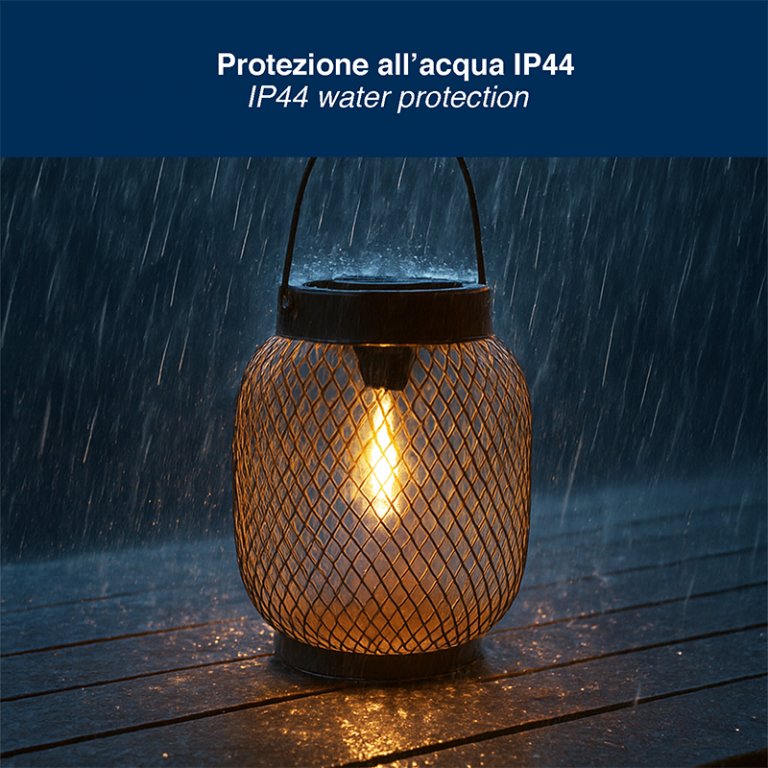 Dotata di luce LED, crea un motivo decorativo grazie al riflesso della luce sul paralume, proiettando giochi di luce suggestivi. Si accende automaticamente al calare del buio, illuminando fino a 4 ore. Realizzata in ferro, è dotata di pannello solare e si ricarica con la sola luce del sole. La protezione IP44 la rende adatta all’uso esterno.