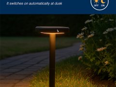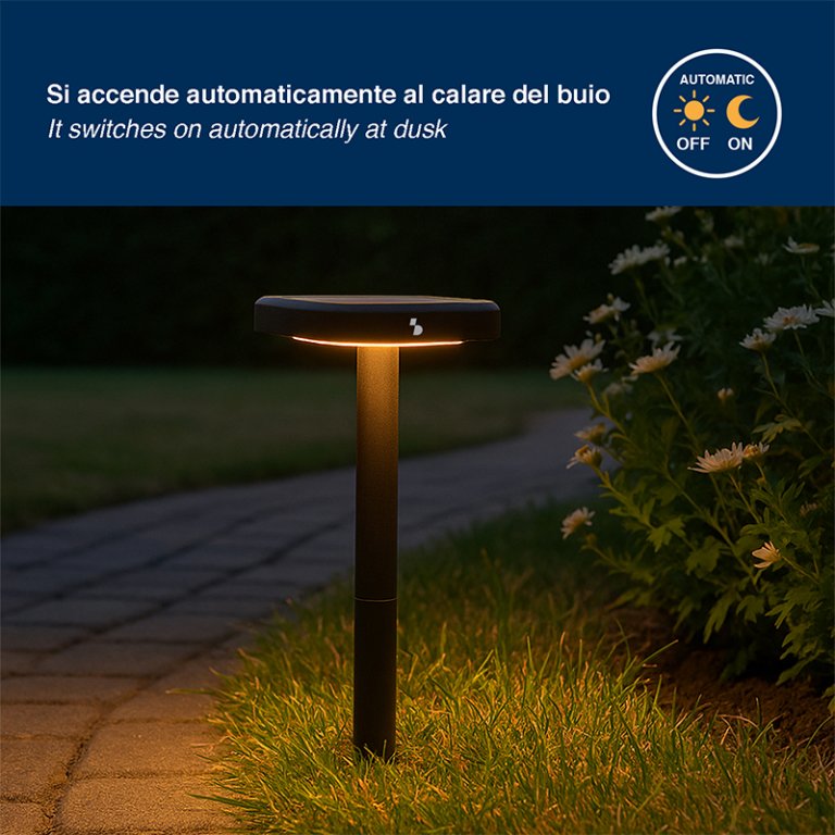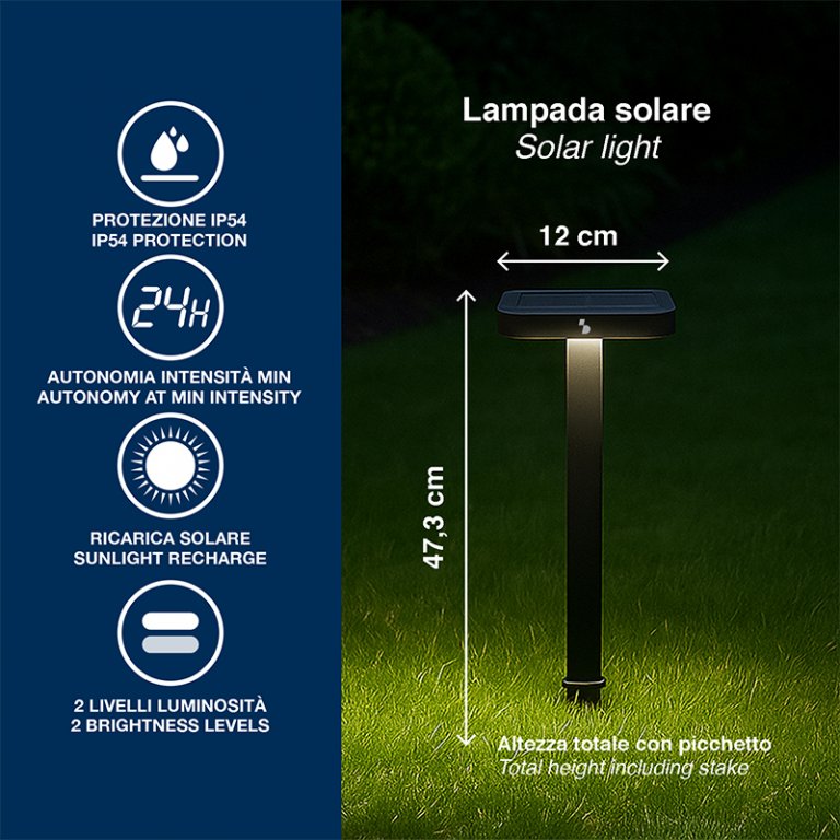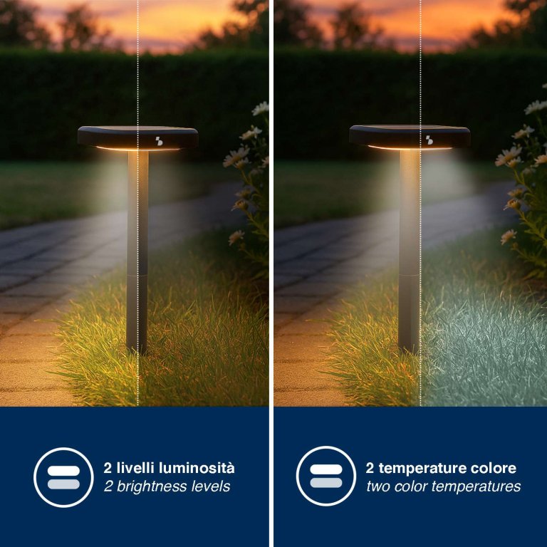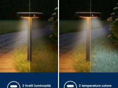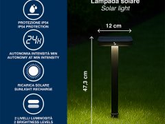 Lampada solare per giardino comprensiva di picchetto. Si accende automaticamente con il buio e si spegne con la luce del giorno. Si ricarica con la luce solare. Il picchetto consente di fissare la lampada al terreno in qualsiasi punto del giardino, accanto alle aiuole o lungo i vialetti. Due livelli di luminosità impostabili e 2 temperature di colore selezionabili.