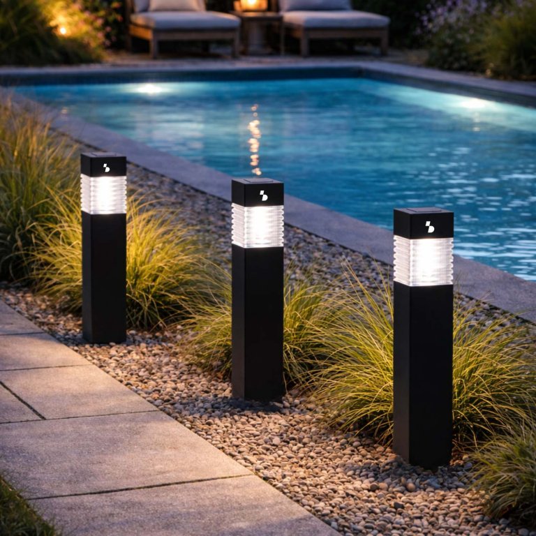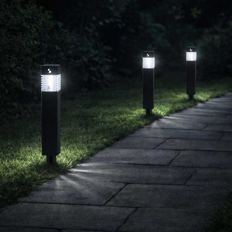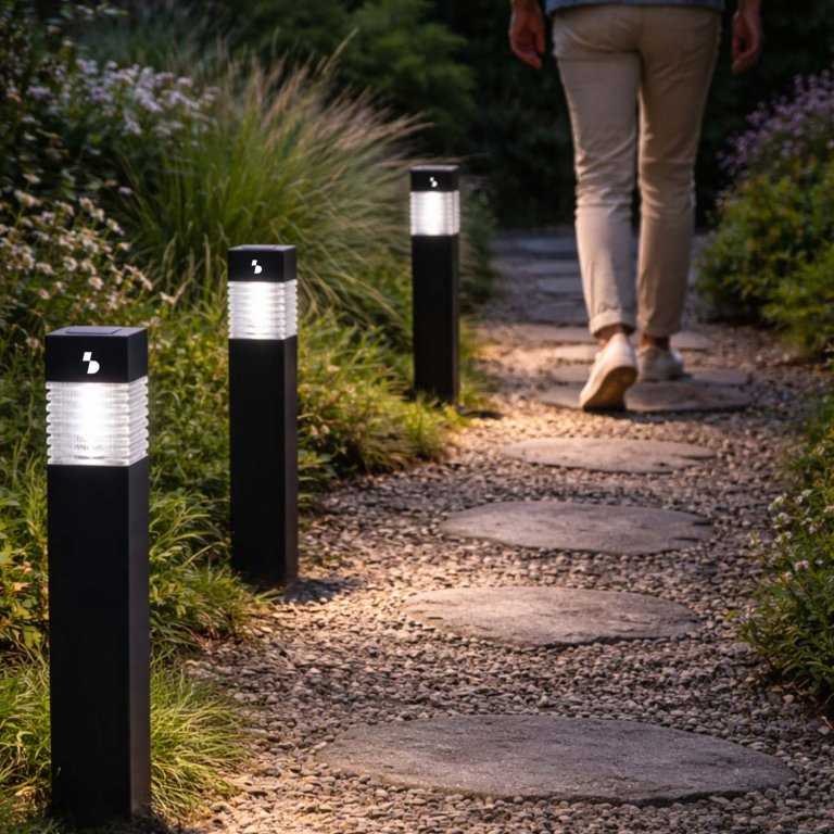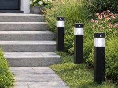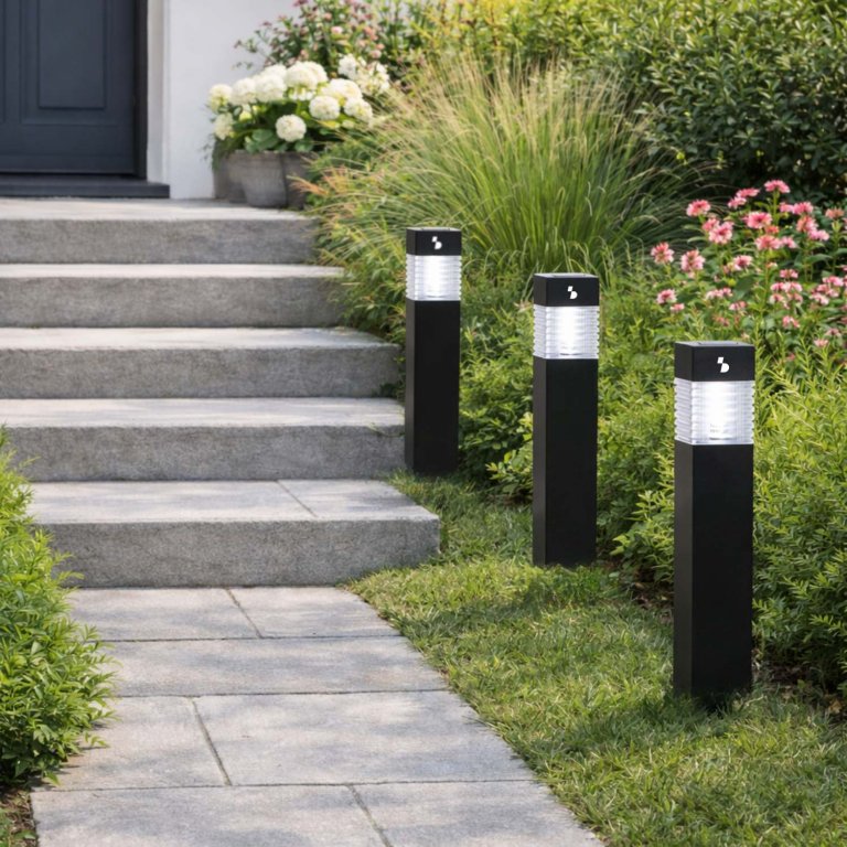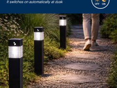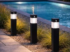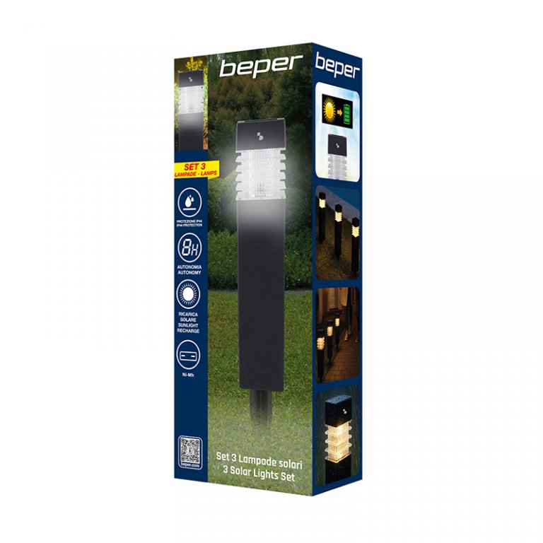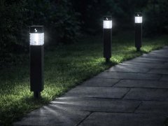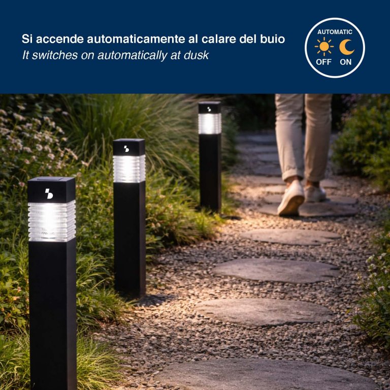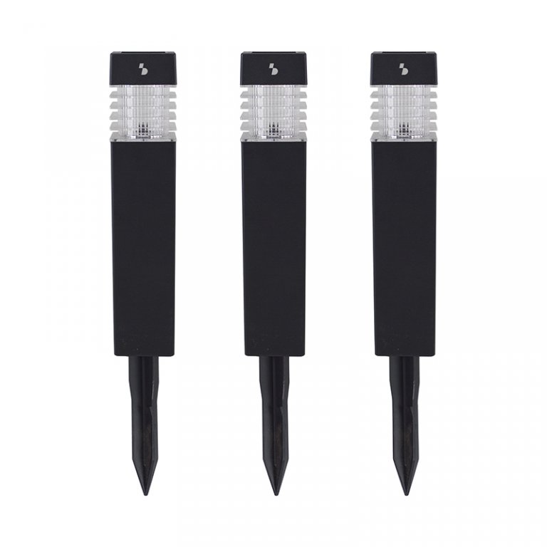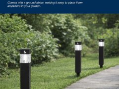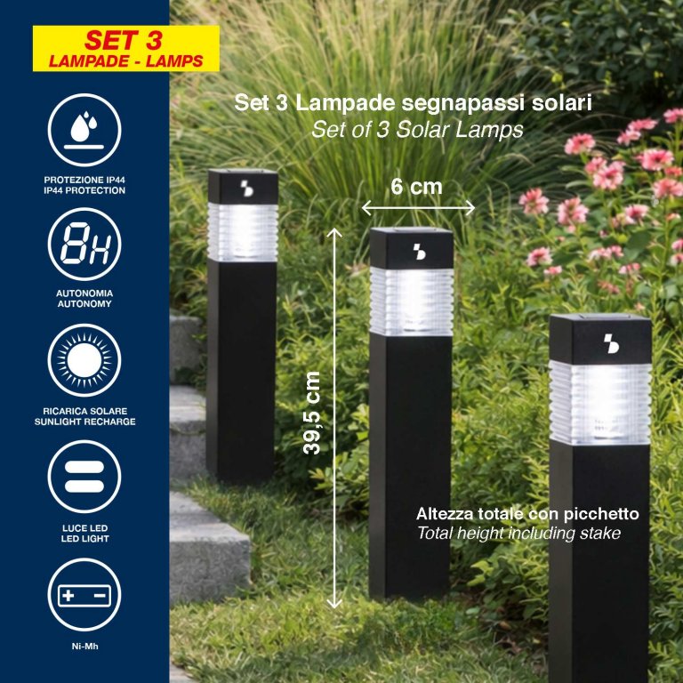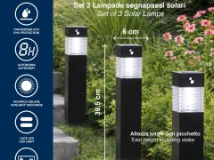 Set di 3 lampade solari segnapassi per vialetti e giardini comprensive di picchetto. Le lampade si accendono automaticamente con il buio e si spegono con la luce del giorno, grazie all'energia che arriva dalla luce solare.