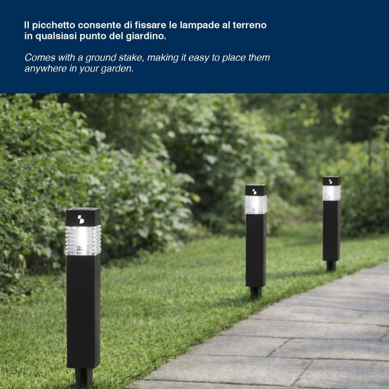 Il picchetto consente di fissare le lampade al terreno in qualsiasi punto del giardino, accanto alle aiuole o lungo i vialetti.
