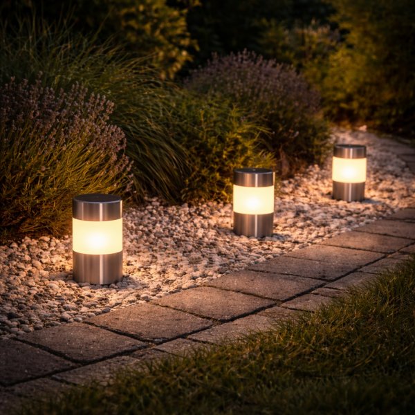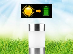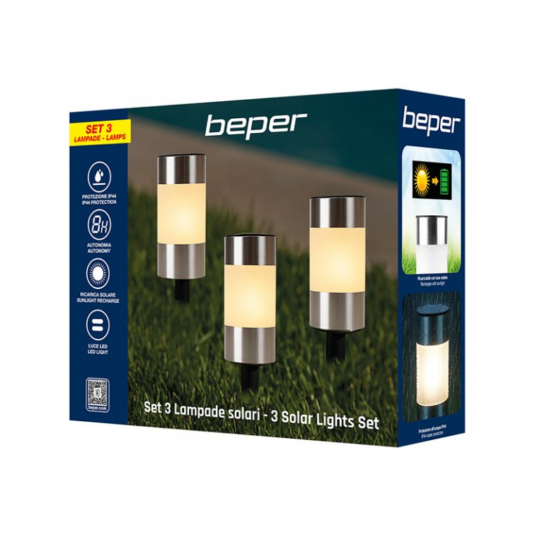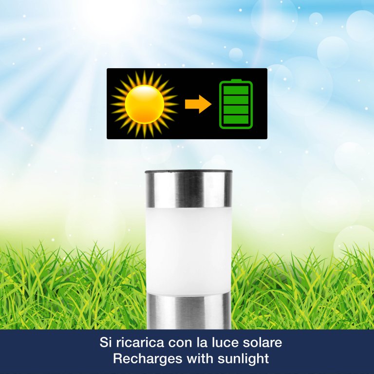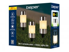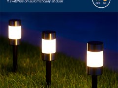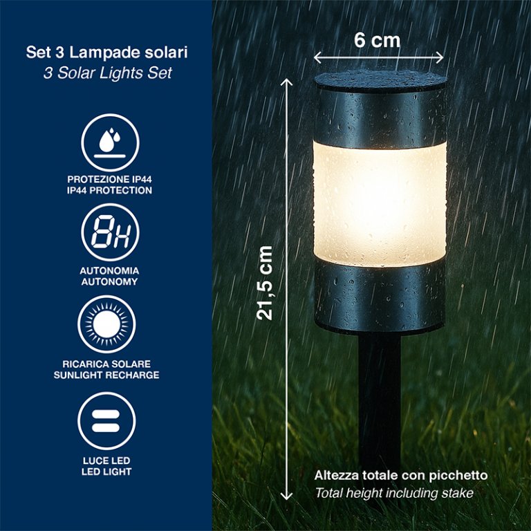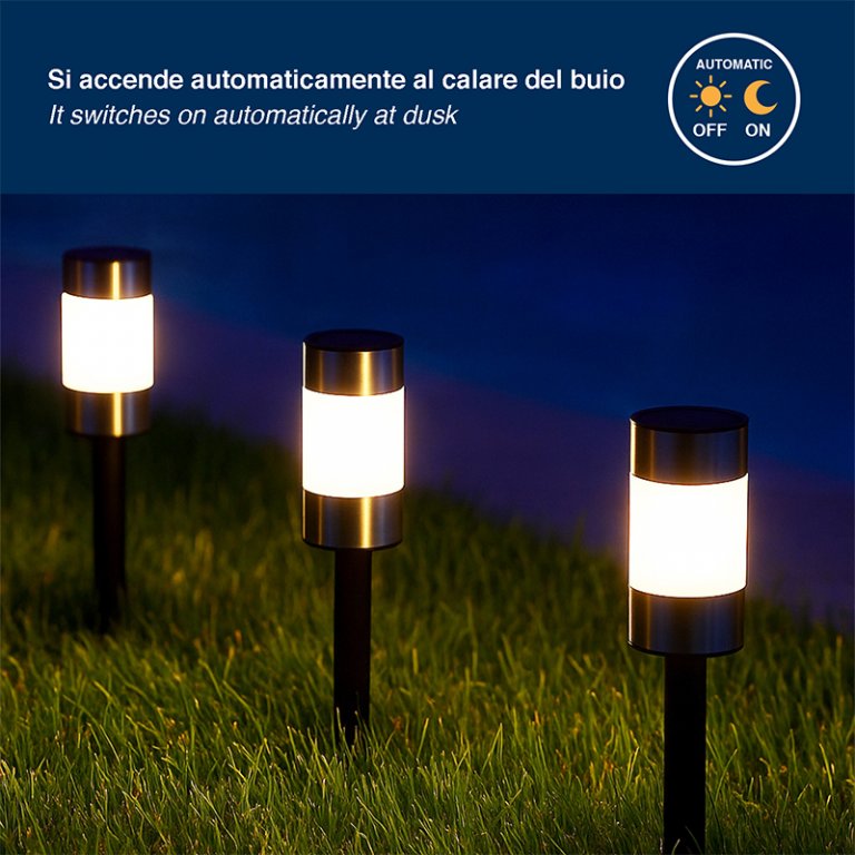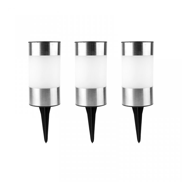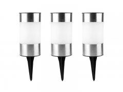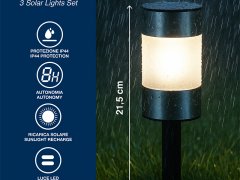 Set di 3 lampade solari segnapassi per vialetti e giardini comprensive di picchetto. Le lampade si accendono automaticamente con il buio e si spegono con la luce del giorno, grazie all'energia che arriva dalla luce solare.