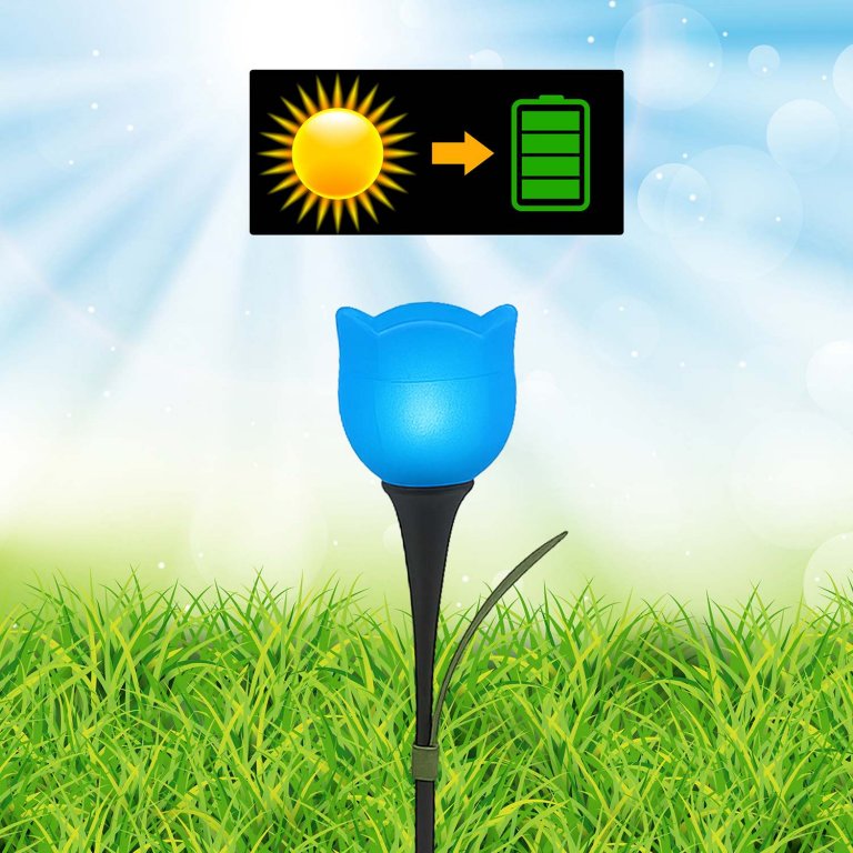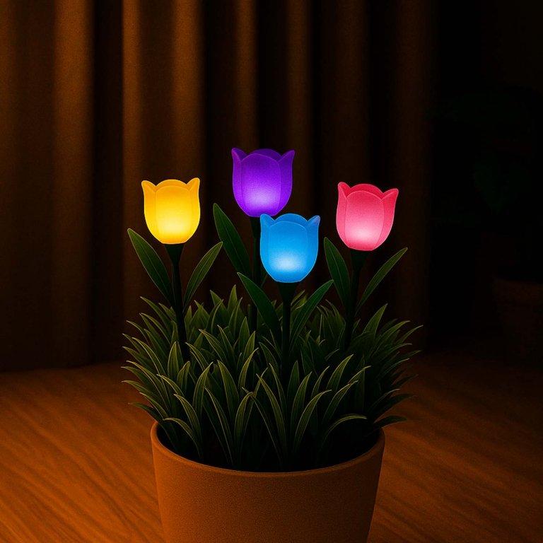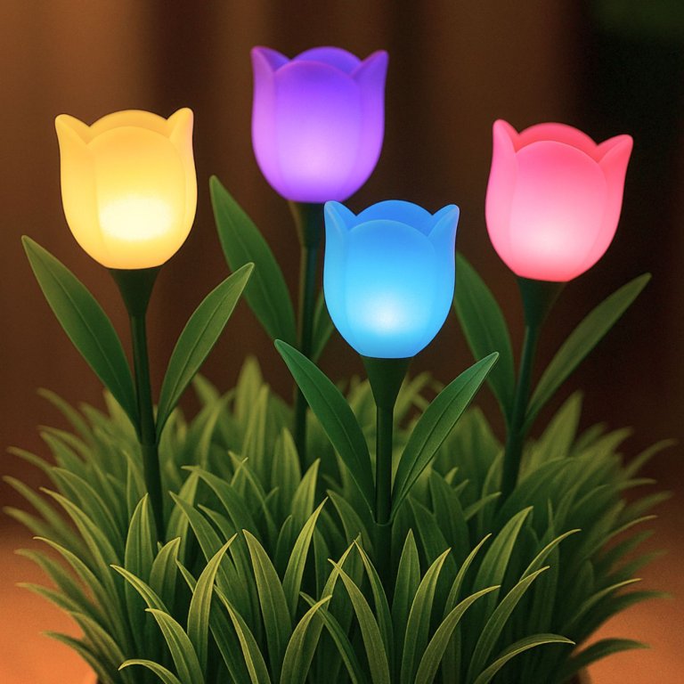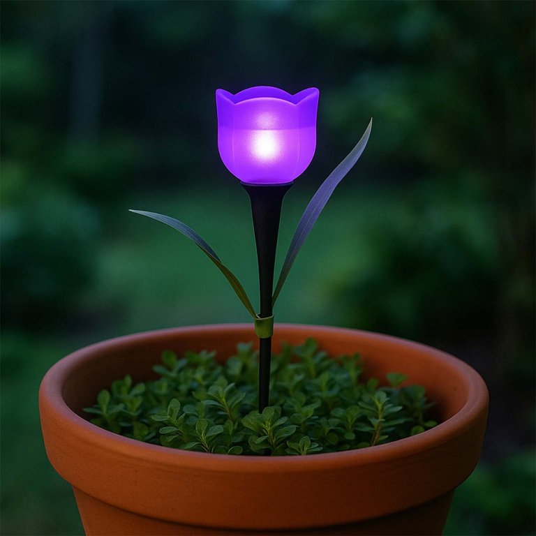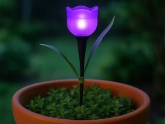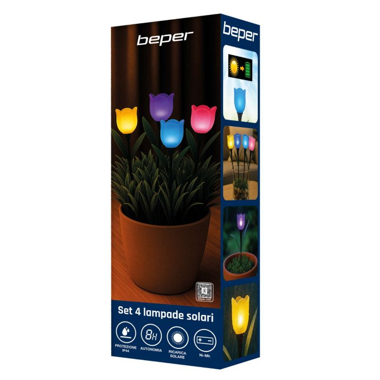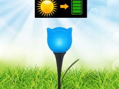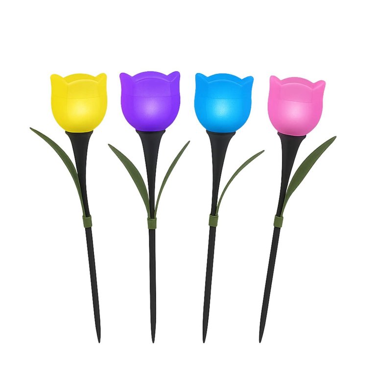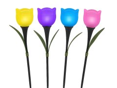 Set di 4 lampade solari a forma di tulipano comprensive di picchetto, ideali per vialetti, giardini e balconi. Le lampade si accendono automaticamente con il buio e si spegono con la luce del giorno, grazie all'energia che arriva dalla luce solare.
