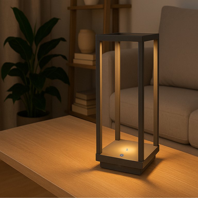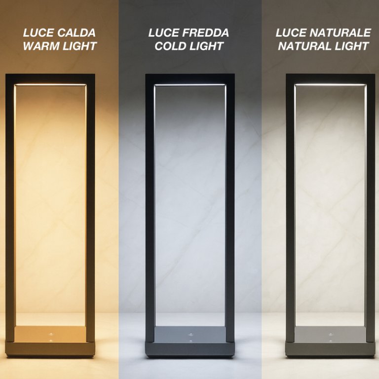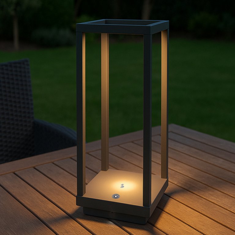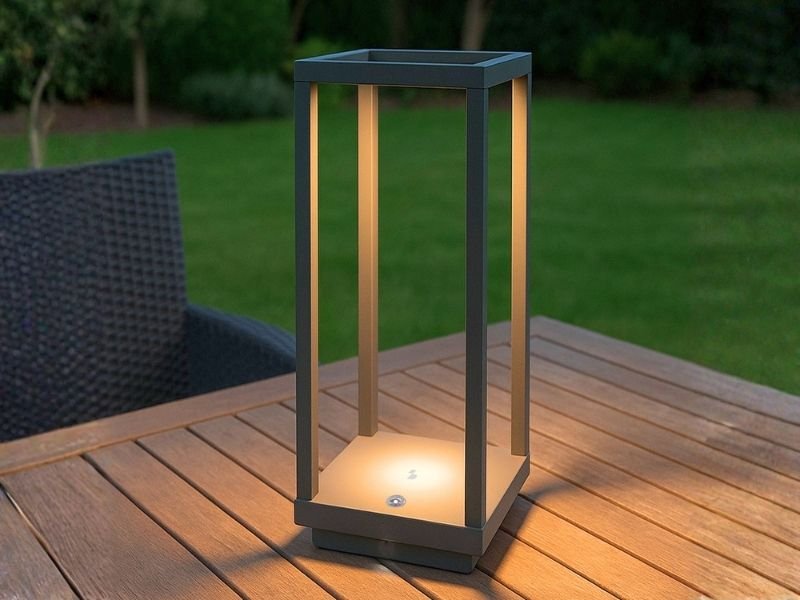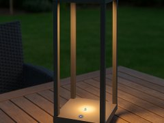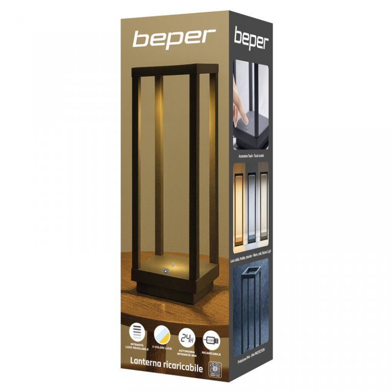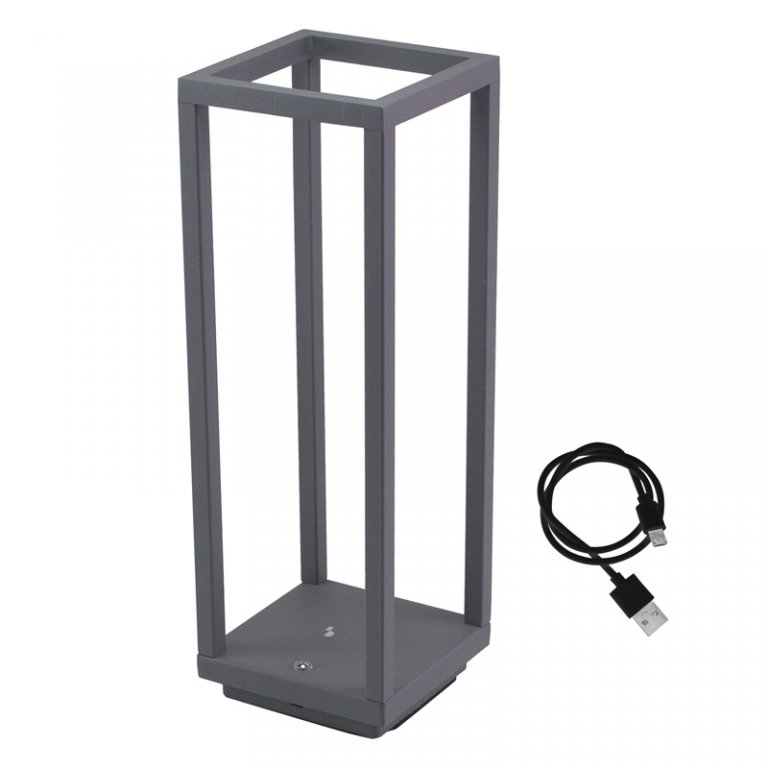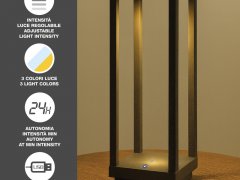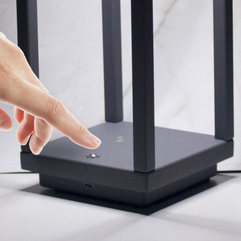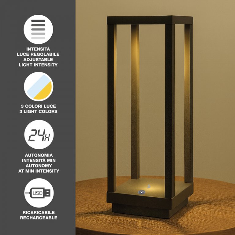 Lanterna ricaricabile in metallo dal design moderno, con pulsante d'accensione sulla base. L’intensità della luce è regolabile ed è possibile scegliere tra luce calda, fredda o naturale. Grazie alla batteria integrata ad alta capacità, offre un’autonomia prolungata (fino a 24 ore a intensità minima). Cavo di ricarica USB incluso nella confezione. Adatta ad ambienti interni ed esterni, grazie alla protezione all'acqua IP44.