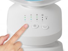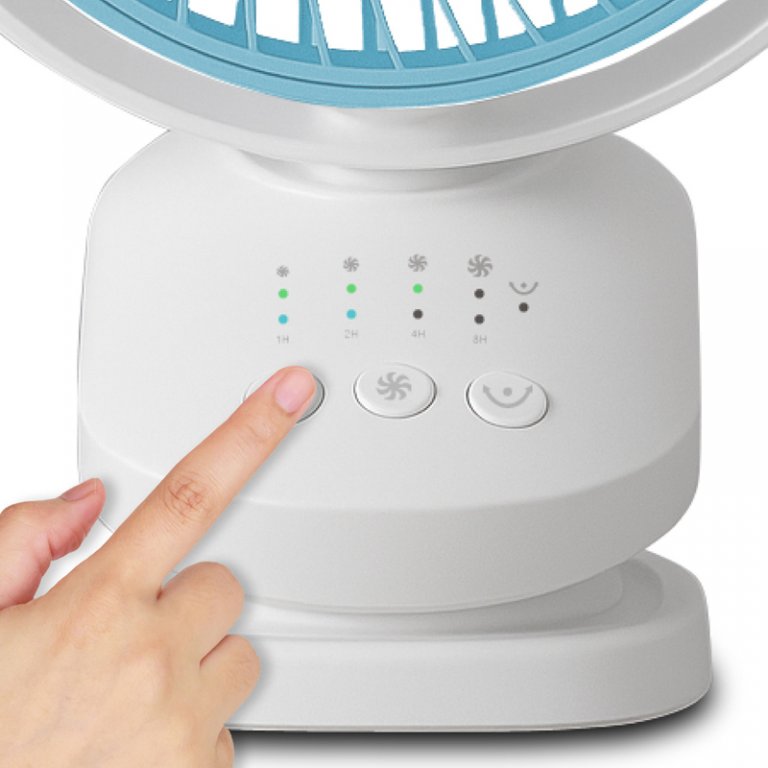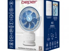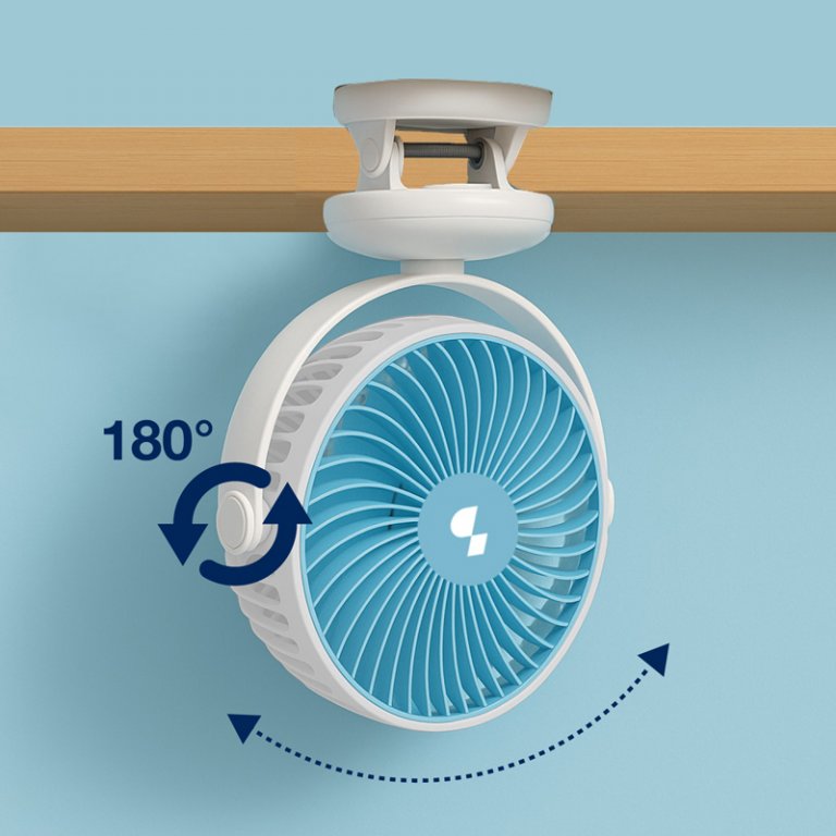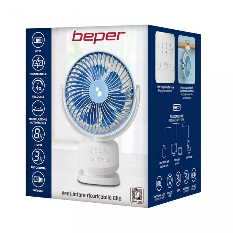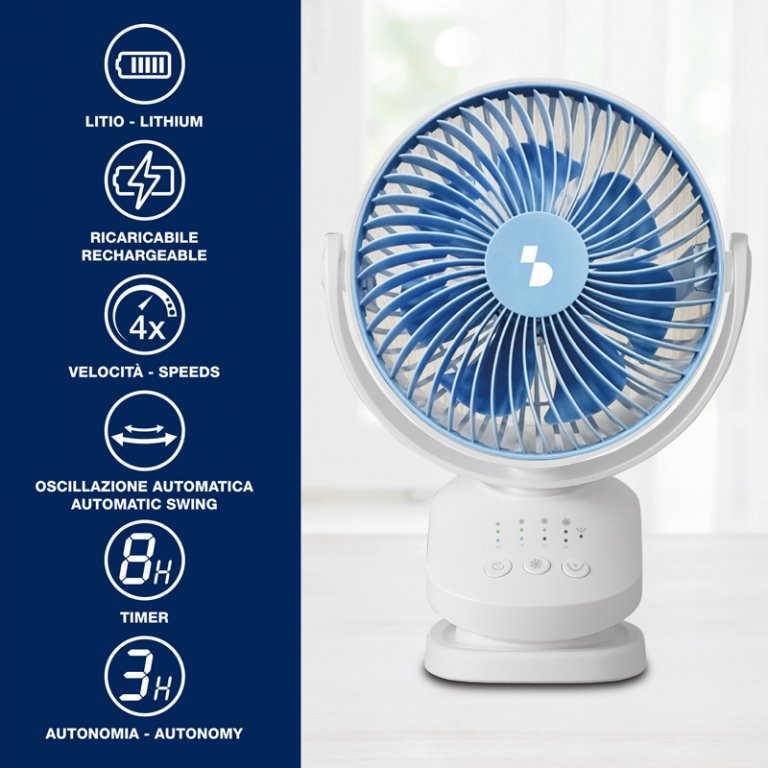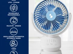 Mini ventilatore ricaricabile, perfetto per le calde giornate estive, anche in viaggio. La batteria al litio da 1800 mAh offre fino a 3 ore di autonomia di funzionamento alla minima velocità in oscillazione, mentre il cavo USB in dotazione consente di utilizzare il ventilatore anche collegato al PC o al laptop. Grazie alla pratica clip con superficie antiscivolo, può essere fissato su qualsiasi superficie (tavoli, mensole, carozzine). Con 3 velocità selezionabili e inclinazione regolabile, è possibile impostare il timer fino ad 8 ore.