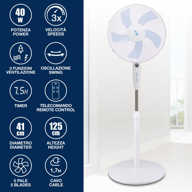 Ventilatore a piantana con 5 pale e griglia protettiva in rete dal diametro di 40 cm, pensato per offrire un comfort elevato e una ventilazione potente ma silenziosa. Grazie all’altezza regolabile fino a 125 cm e alla base tonda stabile, si adatta perfettamente a ogni ambiente domestico. Il flusso d’aria è personalizzabile tramite 3 velocità e 3 modalità di ventilazione (normale, brezza, notturna), per rispondere a ogni esigenza durante il giorno o la notte. La funzione oscillante automatica assicura una distribuzione omogenea dell’aria nella stanza. Timer programmabile e telecomando incluso per un utilizzo semplice e pratico anche a distanza.
