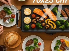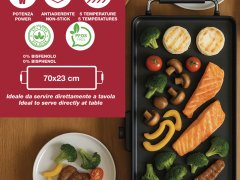 La amplia superficie de asado (70 x 23 cm) permite preparar varios platos a la vez. El revestimiento antiadherente garantiza una cocción baja en grasas y más saludable. Gracias al termostato ajustable de 5 niveles, siempre puede seleccionar la temperatura ideal para una cocción precisa y uniforme. Las asas termoaislantes y el cable desmontable permiten colocar la parrilla directamente en la mesa, convirtiendo cada comida en una experiencia social. La bandeja de goteo extraíble es apta para lavavajillas para máxima comodidad. Gracias a su alto rendimiento, ofrece resultados excelentes de forma constante.